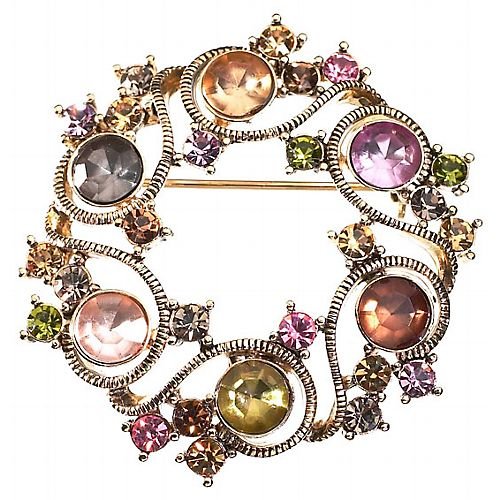 A pinwheel of color and fluttery fancy. 11/2'' diameter goldtone Monet pin features multi-colored (peach, lilac, amber, grey, & green) rhinestones and a gift box.